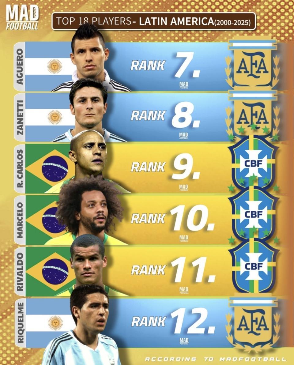 从第七名到第十八名,榜单更多体现了“荣誉+影响力”的综合考量。阿圭罗、萨内蒂、马塞洛、里克尔梅等人都是阿根廷足球的旗帜人物;巴西方面,卡洛斯、里瓦尔多、马塞洛的入选也在意料之中。最后一档的迪玛利亚、克雷斯波、特维斯、马斯切拉诺乃至法尔考,基本是靠着大赛关键表现和国家队地位赢得一席。